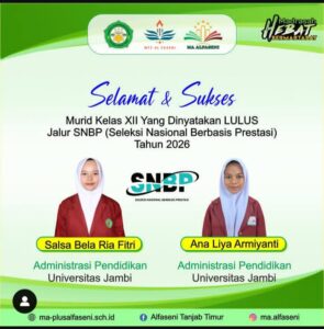 Alhamdulillah, kabar membanggakan datang dari sekolah AL-FASENI. Pada hari Selasa 31 Maret 2026 pukul 15:00 WIB. Ada dua siswa berhasil lulus dalam Seleksi Nasional Berdasarkan Prestasi (SNBP) tahun 2026. Atas nama Ana Liya Armiyanti dan Salsa Bela Ria Fitri yang lulus di Universitas Jambi Jurusan Administrasi Pendidikan. Keberhasilan ini menjadi bukti nyata dari kerja keras, kedisiplinan, serta semangat belajar yang tinggi dari para siswa.